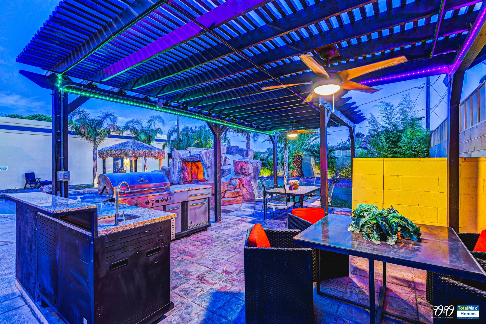 The water attractions are aplenty with various amenities such as a huge resort pool featuring waterfalls, a grotto, swim-up bars with bar benches in the water, a large jetted spa, Hawaiian style Palapa shades, a backyard lined up with palmed trees and bamboos, a water mist and covered sunscreen. Sitting areas are adjacent to the outdoor kitchen and swim-up bar.